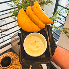 Tuna Mixed with, Chopped Onions, Tomatoes and Mayo then Stuffed inside the Arepa. Served with Salsa Tartara (House Sauce) on the side.