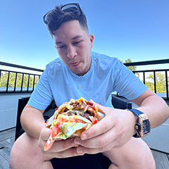 Beef Pattie, Carne Asada, Fried Egg, Bacon, Yellow Cheddar Cheese, Ham, Shredded Lettuce, Roma Tomato, Raw Onion, Mustard, Ketchup, House Sauce, Stick Chips, Parmesan Cheese and Side of French Fries.